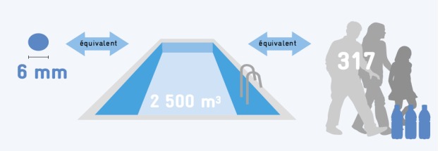Les pertes quotidiennes d'eau traitée sont colossales. Un trou de 6 mm dans une conduite sous pression de 5 bars génère une perte d'eau équivalente à la consommation quotidienne de 317 habitants ou d'une piscine olympique en 2 mois.